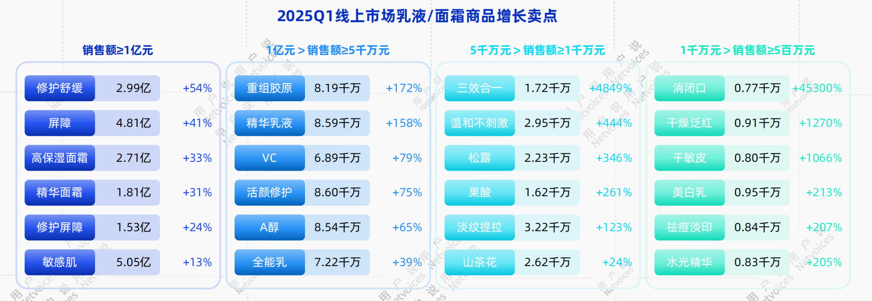 2025年第一季度乳液/面霜品类增长卖点如下可见,高销售额增长卖点主要围绕舒缓,修护屏障为核心,可见修护肌肤屏障健康、敏肌可用等标签将逐渐成为消费者继补水保湿以外又一标准需求。